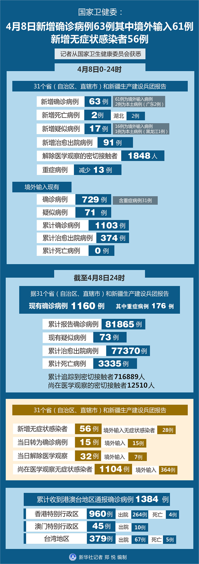 截至4月8日24時(shí),據(jù)31個(gè)?。ㄗ灾螀^(qū)、直轄市)和新疆生產(chǎn)建設(shè)兵團(tuán)報(bào)告,現(xiàn)有確診病例1160例(其中重癥病例176例),累計(jì)治愈出院病例77370例,累計(jì)死亡病例3335例,累計(jì)報(bào)告確診病例81865例,現(xiàn)有疑似病例73例。累計(jì)追蹤到密切接觸者716889人,尚在醫(yī)學(xué)觀察的密切接觸者12510人。