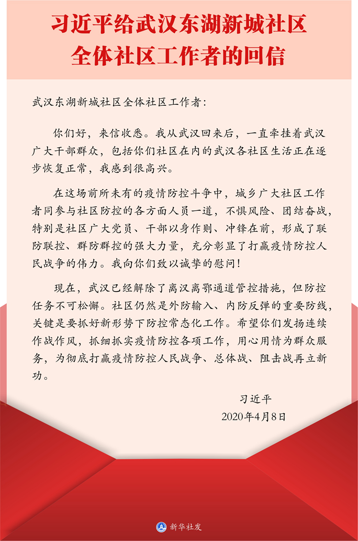 新華社北京4月9日電 中共中央總書記、國家主席、中央軍委主席習(xí)近平4月8日給武漢市東湖新城社區(qū)全體社區(qū)工作者回信,再次肯定城鄉(xiāng)廣大社區(qū)工作者在疫情防控斗爭中發(fā)揮的重要作用,向他們致以誠摯的慰問,并勉勵(lì)他們?yōu)閺氐状蜈A疫情防控人民戰(zhàn)爭、總體戰(zhàn)、阻擊戰(zhàn)再立新功。