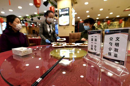 河北廊坊市安次區(qū)一家餐廳內,服務員為客人分餐。新華社供圖