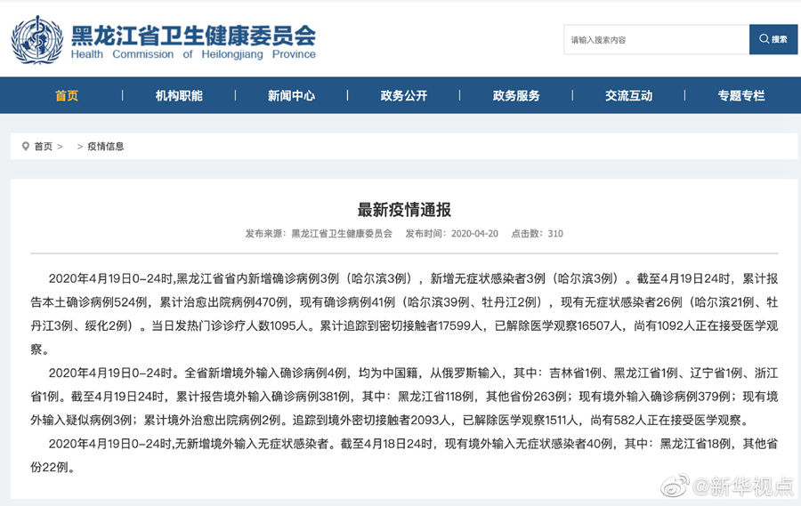 2020年4月19日0-24時(shí),黑龍江省省內(nèi)新增確診病例3例(哈爾濱3例),新增無(wú)癥狀感染者3例(哈爾濱3例)。截至4月19日24時(shí),累計(jì)報(bào)告本土確診病例524例,累計(jì)治愈出院病例470例,現(xiàn)有確診病例41例(哈爾濱39例、牡丹江2例),現(xiàn)有無(wú)癥狀感染者26例(哈爾濱21例、牡丹江3例、綏化2例)。當(dāng)日發(fā)熱門(mén)診診療人數(shù)1095人。累計(jì)追蹤到密切接觸者17599人,已解除醫(yī)學(xué)觀察16507人,尚有1092人正在接受醫(yī)學(xué)觀察。