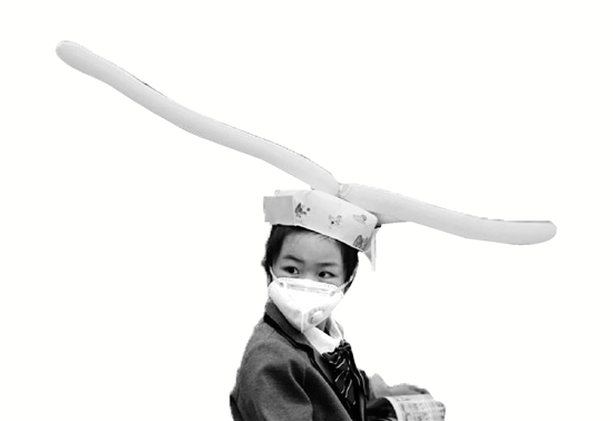 有的是在帽頂上粘了兩只棍子狀的氣球,從左右兩邊長長地伸了出去;有的是把動(dòng)畫片《超級(jí)飛俠》的主角,一架叫“樂迪”的飛機(jī)戴在了頭上當(dāng)帽子,兩側(cè)機(jī)翼展開,剛好一米長;還有的帽子左邊一只長頸鹿,右邊一只大象,脖子長加上鼻子長,也夠一米了;更多娃的帽子,像極了宋朝的官帽。