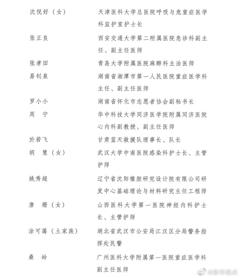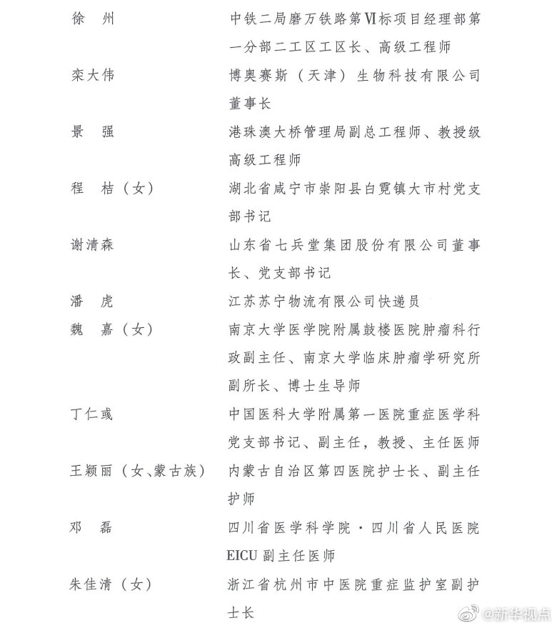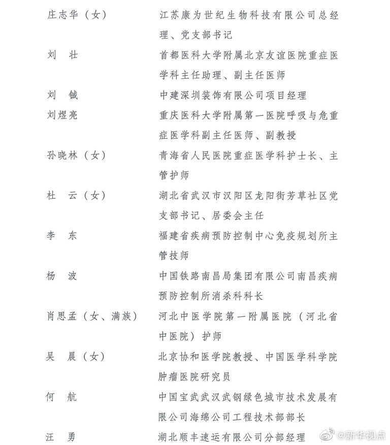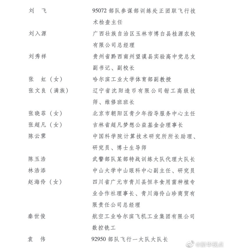 榮獲第24屆“中國青年五四獎(jiǎng)?wù)隆钡姆謩e是:江蘇省南京市鼓樓區(qū)方家營消防救援站站長助理、三級(jí)消防長丁良浩,安徽省滁州市定遠(yuǎn)縣吳圩鎮(zhèn)西孔村黨總支第一書記王萌萌(女),廈門大學(xué)航空航天學(xué)院常務(wù)副院長、特聘教授、博士生導(dǎo)師尤延鋮,湖北省黃岡市羅田縣希望小學(xué)校長方榮(女),浙江每日互動(dòng)網(wǎng)絡(luò)科技股份有限公司董事長兼總經(jīng)理、黨委書記方毅,浙江省杭州市拱墅區(qū)職業(yè)高級(jí)中學(xué)美發(fā)專業(yè)教師石丹(女),國家超級(jí)計(jì)算無錫中心副主任付昊桓,中國石油大港油田公司第二采油廠作業(yè)二區(qū)注采二組副組長馮萌萌(女),寧夏回族自治區(qū)石嘴山市中醫(yī)醫(yī)院副主任醫(yī)師朱斌,中國國家女子排球隊(duì)隊(duì)員、隊(duì)長朱婷(女),95072部隊(duì)參謀部訓(xùn)練處正團(tuán)職飛行技術(shù)檢查主任劉飛,廣西壯族自治區(qū)玉林市博白縣桂源農(nóng)牧有限公司總經(jīng)理劉入源,貴州省黔西南州望謨縣實(shí)驗(yàn)高中黨總支副書記、副校長劉秀祥,哈爾濱工業(yè)大學(xué)體育部副教授張虹(女),遼寧省沈陽造幣有限公司鉗工高級(jí)技師、維修班班長張文良(滿族),北京市朝陽區(qū)青少年指導(dǎo)服務(wù)中心主任張曉菲(女),吉林省超凡夢(mèng)想公益基金會(huì)理事長張超凡(女),中國科學(xué)院計(jì)算技術(shù)研究所所長助理、研究員、博士生導(dǎo)師陳云霽,武警部隊(duì)某部特戰(zhàn)訓(xùn)練大隊(duì)代理大隊(duì)長陳玉浩,中山大學(xué)中山眼科中心副主任、研究員林浩添,四川省廣元市青川縣恒豐食用菌種植專業(yè)合作社理事長、青川海伶山珍商貿(mào)有限責(zé)任公司總經(jīng)理趙海伶(女),航空工業(yè)哈爾濱飛機(jī)工業(yè)集團(tuán)有限公司數(shù)控銑工秦世俊,92950部隊(duì)飛行一大隊(duì)大隊(duì)長袁偉,中鐵二局磨萬鐵路第Ⅵ標(biāo)項(xiàng)目經(jīng)理部第一分部二工區(qū)工區(qū)長、高級(jí)工程師徐州,博奧賽斯(天津)生物科技有限公司董事長欒大偉,港珠澳大橋管理局副總工程師、教授級(jí)高級(jí)工程師景強(qiáng),湖北省咸寧市崇陽縣白霓鎮(zhèn)大市村黨支部書記程桔(女),山東省七兵堂集團(tuán)股份有限公司董事長、黨支部書記謝清森,江蘇蘇寧物流有限公司快遞員潘虎,南京大學(xué)醫(yī)學(xué)院附屬鼓樓醫(yī)院腫瘤科行政副主任、南京大學(xué)臨床腫瘤學(xué)研究所副所長、博士生導(dǎo)師魏嘉(女),中國醫(yī)科大學(xué)附屬第一醫(yī)院重癥醫(yī)學(xué)科黨支部書記、副主任,教授、主任醫(yī)師丁仁彧,內(nèi)蒙古自治區(qū)第四醫(yī)院護(hù)士長、副主任護(hù)師王穎麗(女、蒙古族),四川省醫(yī)學(xué)科學(xué)院·四川省人民醫(yī)院EICU副主任醫(yī)師鄧?yán)?,浙江省杭州市中醫(yī)院重癥監(jiān)護(hù)室副護(hù)士長朱佳清(女),江蘇康為世紀(jì)生物科技有限公司總經(jīng)理、黨支部書記莊志華(女),首都醫(yī)科大學(xué)附屬北京友誼醫(yī)院重癥醫(yī)學(xué)科主任助理、副主任醫(yī)師劉壯,中建深圳裝飾有限公司項(xiàng)目經(jīng)理劉鋮,重慶醫(yī)科大學(xué)附屬第一醫(yī)院呼吸與危重癥醫(yī)學(xué)科副主任醫(yī)師、副教授劉煜亮,青海省人民醫(yī)院重癥醫(yī)學(xué)科護(hù)士長、主管護(hù)師孫曉林(女),湖北省武漢市漢陽區(qū)龍陽街芳草社區(qū)黨支部書記、居委會(huì)主任杜云(女),福建省疾病預(yù)防控制中心免疫規(guī)劃所主管技師李東,中國鐵路南昌局集團(tuán)有限公司南昌疾病預(yù)防控制所消殺科科長楊波,河北中醫(yī)學(xué)院第一附屬醫(yī)院(河北省中醫(yī)院)護(hù)師肖思孟(女、滿族),北京協(xié)和醫(yī)學(xué)院教授、中國醫(yī)學(xué)科學(xué)院腫瘤醫(yī)院研究員吳晨(女),中國寶武武漢武鋼綠色城市技術(shù)發(fā)展有限公司海綿公司工程技術(shù)部部長何航,湖北順豐速運(yùn)有限公司分部經(jīng)理汪勇,天津醫(yī)科大學(xué)總醫(yī)院呼吸與危重癥醫(yī)學(xué)科監(jiān)護(hù)室護(hù)士長沈悅好(女),西安交通大學(xué)第二附屬醫(yī)院急診科副主任、副主任醫(yī)師張正良,青島大學(xué)附屬醫(yī)院麻醉科主治醫(yī)師張孝田,湖南省湘潭市第一人民醫(yī)院重癥醫(yī)學(xué)科主任、副主任醫(yī)師易釗泉,湖南省懷化市志愿者協(xié)會(huì)副秘書長羅小小,華中科技大學(xué)同濟(jì)醫(yī)學(xué)院附屬同濟(jì)醫(yī)院心內(nèi)科副教授、副主任醫(yī)師周寧,甘肅藍(lán)天救援隊(duì)理事長、隊(duì)長於若飛,武漢大學(xué)中南醫(yī)院感染科護(hù)士長、主管護(hù)師胡慧(女),遼寧省沈陽橡膠研究設(shè)計(jì)院有限公司研發(fā)中心基礎(chǔ)理論與材料研究主任工程師姚秀超,山西醫(yī)科大學(xué)第一醫(yī)院神經(jīng)內(nèi)科護(hù)士長、主管護(hù)師唐珊(女),湖北省武漢市公安局江漢區(qū)分局警務(wù)指揮處民警涂可藹(土家族),廣州醫(yī)科大學(xué)附屬第一醫(yī)院重癥醫(yī)學(xué)科副主任醫(yī)師桑嶺,湖北省武漢市第三醫(yī)院重癥醫(yī)學(xué)科副主任醫(yī)師董芳(女),東南大學(xué)附屬中大醫(yī)院重癥醫(yī)學(xué)科主任醫(yī)師潘純。