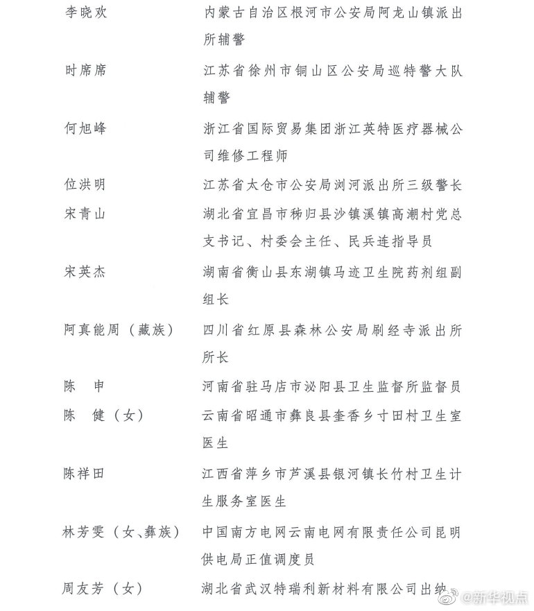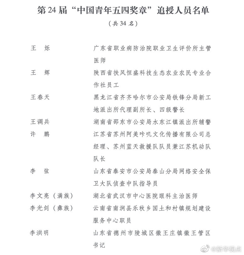 第24屆“中國青年五四獎(jiǎng)?wù)隆弊肥谌藛T分別是:廣東省職業(yè)病防治院職業(yè)衛(wèi)生評(píng)價(jià)所主管醫(yī)師王爍,陜西省扶風(fēng)恒盛科技生態(tài)農(nóng)業(yè)農(nóng)民專業(yè)合作社員工王輝,黑龍江省齊齊哈爾市公安局鐵鋒分局新工地派出所代理副所長、四級(jí)警長王春天,湖南省邵東市公安局水東江鎮(zhèn)派出所輔警王調(diào)兵,江蘇省蘇州阿美咔嘰文化傳播有限公司總經(jīng)理、蘇州藍(lán)天救援隊(duì)隊(duì)員兼江蘇機(jī)動(dòng)隊(duì)隊(duì)長許鵬,山東省泰安市公安局泰山分局網(wǎng)絡(luò)安全保衛(wèi)大隊(duì)偵查中隊(duì)指導(dǎo)員李弦,湖北省武漢市中心醫(yī)院眼科主治醫(yī)師李文亮(滿族),云南省南澗縣樂秋鄉(xiāng)國土和村鎮(zhèn)規(guī)劃建設(shè)服務(wù)中心職員李光劍(彝族),山東省德州市陵城區(qū)徽王莊鎮(zhèn)徽王管區(qū)書記李洪明,內(nèi)蒙古自治區(qū)根河市公安局阿龍山鎮(zhèn)派出所輔警李曉歡,江蘇省徐州市銅山區(qū)公安局巡特警大隊(duì)輔警時(shí)席席,浙江省國際貿(mào)易集團(tuán)浙江英特醫(yī)療器械公司維修工程師何旭峰,江蘇省太倉市公安局瀏河派出所三級(jí)警長位洪明,湖北省宜昌市秭歸縣沙鎮(zhèn)溪鎮(zhèn)高潮村黨總支書記、村委會(huì)主任、民兵連指導(dǎo)員宋青山,湖南省衡山縣東湖鎮(zhèn)馬跡衛(wèi)生院藥劑組副組長宋英杰,四川省紅原縣森林公安局刷經(jīng)寺派出所所長阿真能周(藏族),河南省駐馬店市泌陽縣衛(wèi)生監(jiān)督所監(jiān)督員陳申,云南省昭通市彝良縣奎香鄉(xiāng)寸田村衛(wèi)生室醫(yī)生陳?。ㄅ?,江西省萍鄉(xiāng)市蘆溪縣銀河鎮(zhèn)長竹村衛(wèi)生計(jì)生服務(wù)室醫(yī)生陳祥田,中國南方電網(wǎng)云南電網(wǎng)有限責(zé)任公司昆明供電局正值調(diào)度員林芳雯(女、彝族),湖北省武漢特瑞利新材料有限公司出納周友芳(女),安徽省銅陵市樅陽縣公安局特(巡)警大隊(duì)輔警一中隊(duì)副隊(duì)長胡鋒,四川省甘孜藏族自治州得榮縣龍絨寺寺廟管理委員會(huì)主任洛絨益西(藏族),四川省廣元經(jīng)開區(qū)盤龍鎮(zhèn)深溝村村民宮高明,江蘇省南京市公安局高淳分局淳溪派出所輔警袁劍雄,山東省泰安市岱岳區(qū)角峪鎮(zhèn)先鋒村村民賈慶臣,湖北省武漢市蔡甸區(qū)人民醫(yī)院住院醫(yī)師夏思思(女),江蘇省南京市公安局行政審批服務(wù)處網(wǎng)絡(luò)政務(wù)科一級(jí)警員徐昊,江蘇省徐州市沛縣公安局五段派出所輔警章良志,湖北省武漢市江夏區(qū)第一人民醫(yī)院醫(yī)師彭銀華,廣東省英德市公安局橋頭派出所輔警曾文聰,江西省蓮花縣湖上鄉(xiāng)中心衛(wèi)生院醫(yī)生熊波,河南省鄭州市公安局東風(fēng)路分局治安管理服務(wù)大隊(duì)三中隊(duì)民警、四級(jí)警長樊樹鋒,甘肅省舟曲縣扶貧辦副主任張小娟(女、藏族)。
