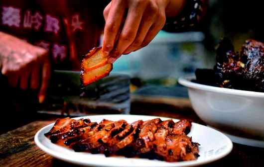 周紅珍用蒸熟的臘肉招待慕名而來(lái)的客人(4月27日攝)。