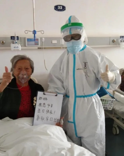 △3月18日,武漢大學人民醫(yī)院東院區(qū)新冠肺炎21病區(qū),醫(yī)務人員為90歲的周太婆祝壽。