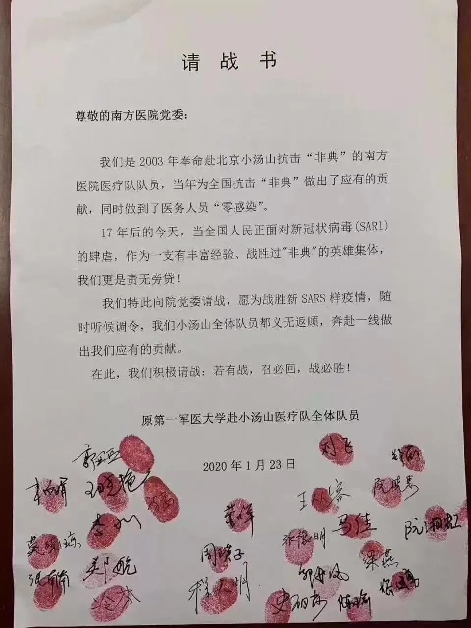 △1月23日,曾參加原第一軍醫(yī)大學赴小湯山醫(yī)療隊的南方醫(yī)院24名醫(yī)護人員寫下請戰(zhàn)書,主動要求赴一線工作。