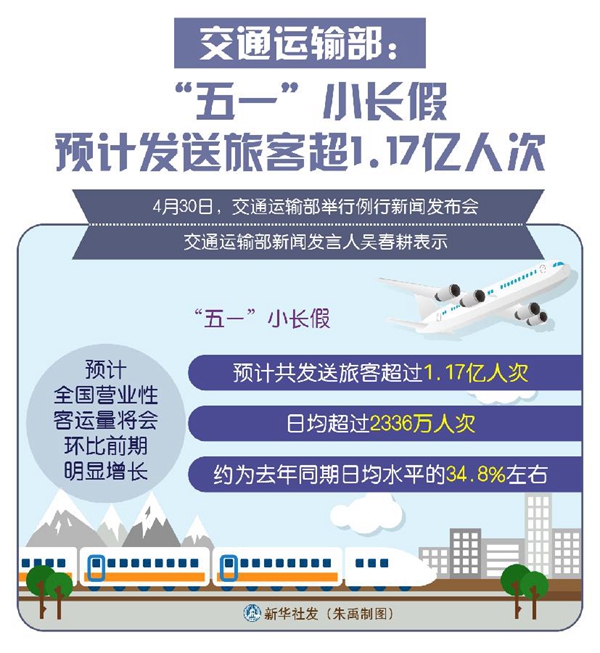 新華社北京4月30日電(記者樊曦、魏玉坤)30日,交通運輸部舉行例行新聞發(fā)布會。交通運輸部新聞發(fā)言人吳春耕表示,“五一”小長假,預(yù)計全國營業(yè)性客運量將會環(huán)比前期明顯增長,預(yù)計共發(fā)送旅客超過1.17億人次。