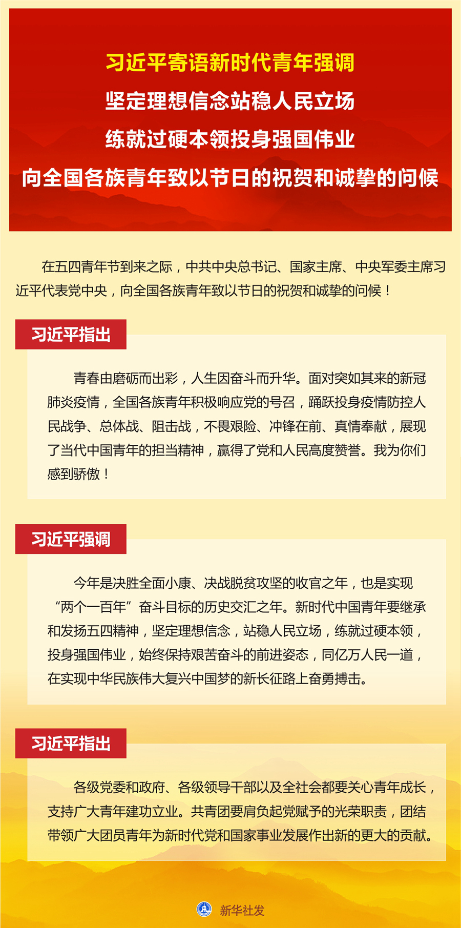 新華社北京5月3日電 在五四青年節(jié)到來之際,中共中央總書記、國家主席、中央軍委主席習(xí)近平代表黨中央,向全國各族青年致以節(jié)日的祝賀和誠摯的問候!