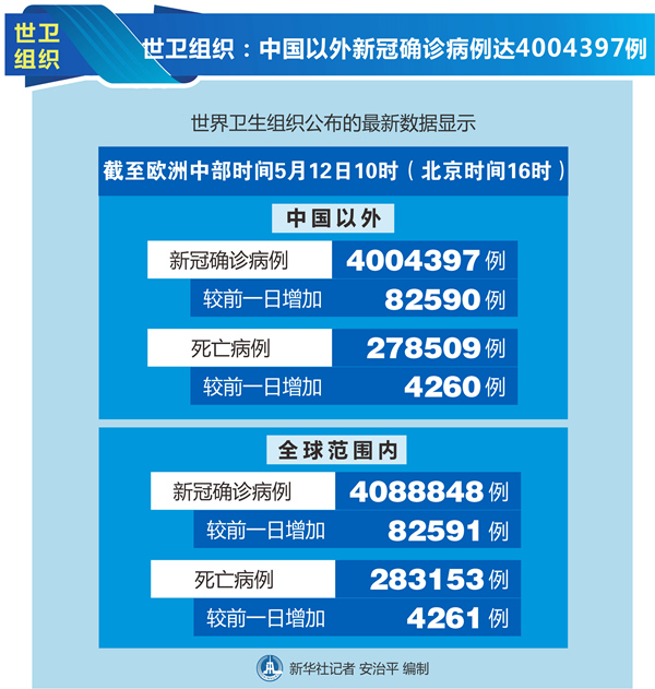 新華社日內(nèi)瓦5月12日電(記者劉曲)世界衛(wèi)生組織12日公布的最新數(shù)據(jù)顯示,中國以外新冠確診病例達(dá)到4004397例。