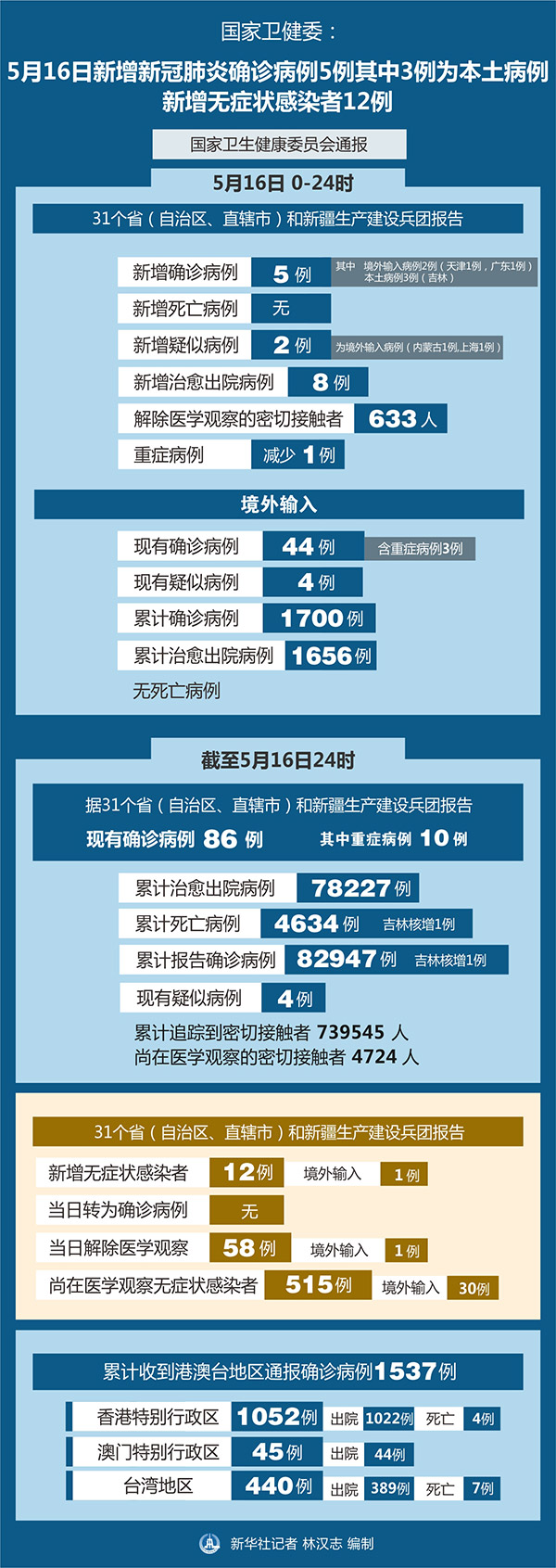 截至5月16日24時,據(jù)31個?。ㄗ灾螀^(qū)、直轄市)和新疆生產(chǎn)建設兵團報告,現(xiàn)有確診病例86例(其中重癥病例10例),累計治愈出院病例78227例,累計死亡病例4634例(吉林核增1例),累計報告確診病例82947例(吉林核增1例),現(xiàn)有疑似病例4例。累計追蹤到密切接觸者739545人,尚在醫(yī)學觀察的密切接觸者4724人。