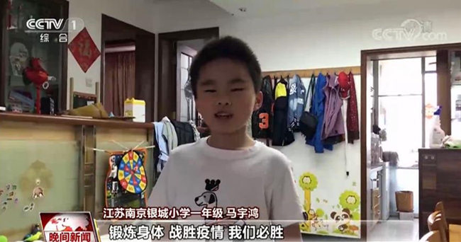 江蘇南京銀城小學(xué)一年級(jí) 馬宇鴻:在家我學(xué)到了一些新技能。前滾翻、雙手拍籃球、玩橢圓機(jī)……鍛煉身體,戰(zhàn)勝疫情,我們必勝!