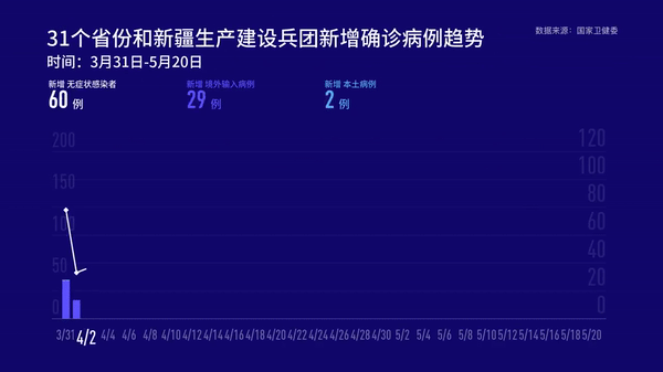 5月20日0—24時(shí),31個(gè)省(自治區(qū)、直轄市)和新疆生產(chǎn)建設(shè)兵團(tuán)報(bào)告新增確診病例2例,其中境外輸入病例1例(在廣東),本土病例1例(在上海);無新增死亡病例;新增疑似病例1例,為境外輸入病例(在上海)。