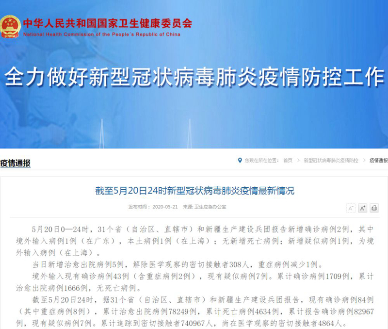 截至5月20日24時(shí)新型冠狀病毒肺炎疫情最新情況
