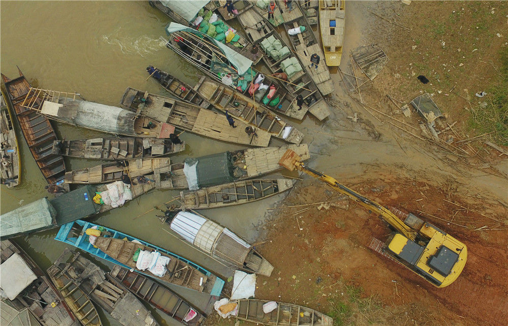 在湖南常德漢壽縣蔣家嘴鎮(zhèn),工作人員在洞庭湖邊駕駛挖掘機(jī)回收漁船(2019年12月17日攝,無(wú)人機(jī)照片)。新華社記者 薛宇舸 攝