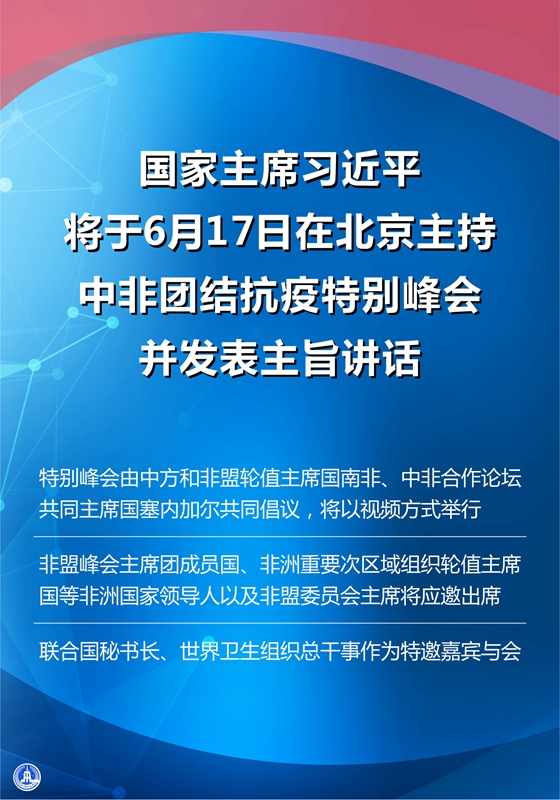 特別峰會由中方和非盟輪值主席國南非、中非合作論壇共同主席國塞內加爾共同倡議,將以視頻方式舉行。非盟峰會主席團成員國、非洲重要次區(qū)域組織輪值主席國等非洲國家領導人以及非盟委員會主席將應邀出席。聯合國秘書長、世界衛(wèi)生組織總干事作為特邀嘉賓與會。