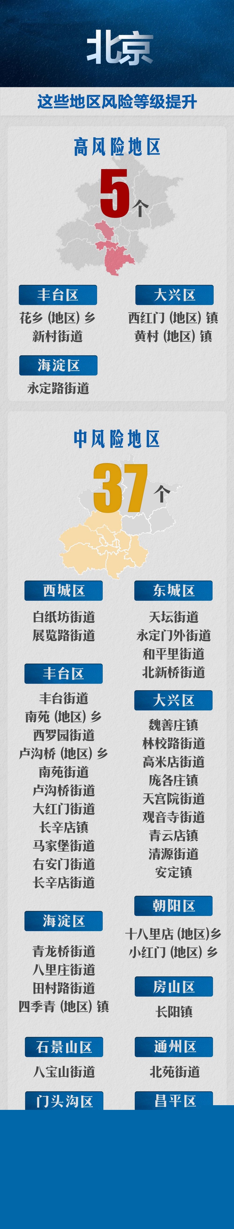 目前,北京有5個(gè)高風(fēng)險(xiǎn)區(qū)和37個(gè)中風(fēng)險(xiǎn)區(qū)。
