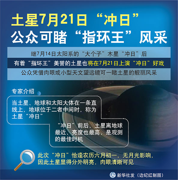 新華社天津7月19日電(記者周潤?。├^7月14日太陽系的“大個子”木星“沖日”后,有著“指環(huán)王”美譽(yù)的土星也將在7月21日上演“沖日”好戲,公眾憑借肉眼或小型天文望遠(yuǎn)鏡可一睹土星的靚麗風(fēng)采。