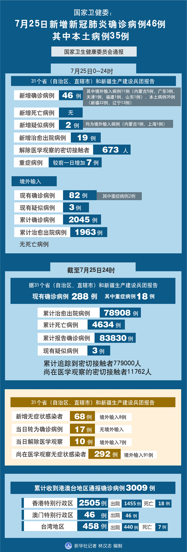 截至7月25日24時(shí),據(jù)31個(gè)?。ㄗ灾螀^(qū)、直轄市)和新疆生產(chǎn)建設(shè)兵團(tuán)報(bào)告,現(xiàn)有確診病例288例(其中重癥病例18例),累計(jì)治愈出院病例78908例,累計(jì)死亡病例4634例,累計(jì)報(bào)告確診病例83830例,現(xiàn)有疑似病例3例。累計(jì)追蹤到密切接觸者779000人,尚在醫(yī)學(xué)觀察的密切接觸者11762人。