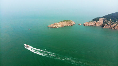7月16日,“擁軍船”在蘇山島海域航行(無(wú)人機(jī)照片)。新華社記者 王凱 攝