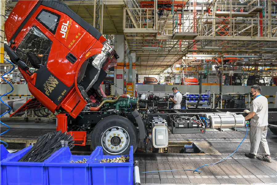 在位于長(zhǎng)春的一汽解放總裝車間,工人在裝配車輛(6月19日攝)。新華社記者 張楠 攝