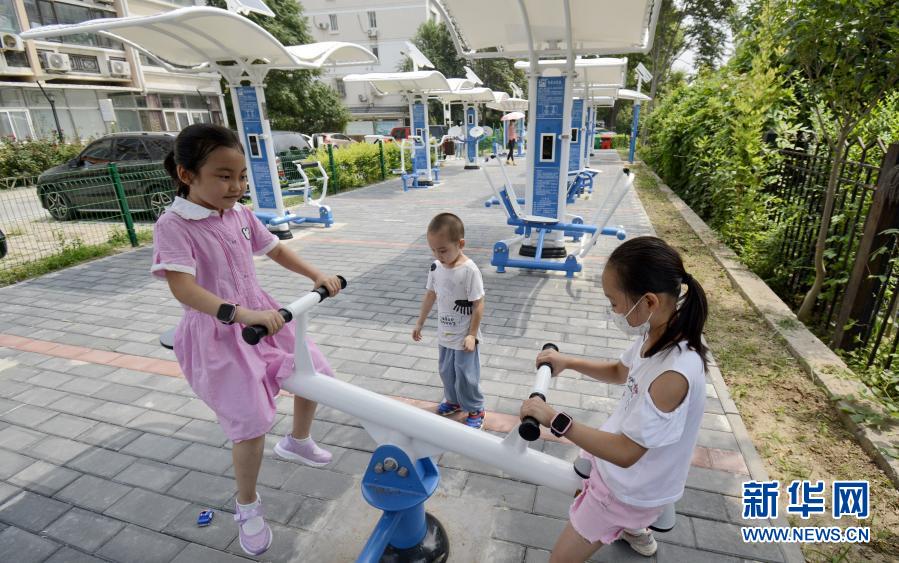 孩子們在回龍觀龍澤苑社區(qū)內的健身廣場玩耍(8月11日攝)。新華社記者 李欣 攝