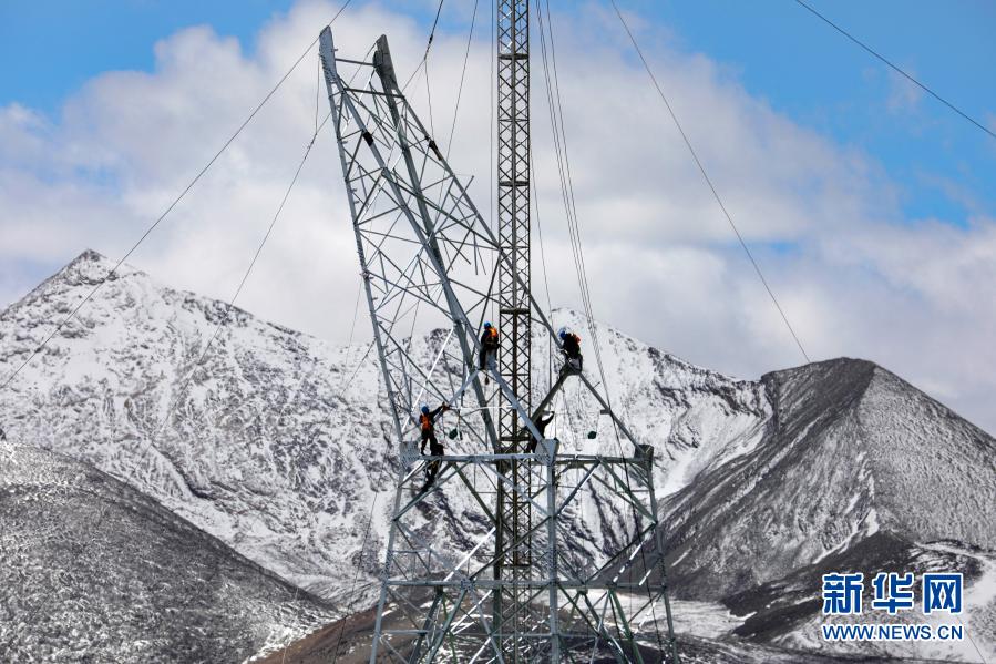 在西藏阿里地區(qū)噶爾縣,施工人員在西藏阿里與藏中電網(wǎng)聯(lián)網(wǎng)工程線路13標(biāo)段進(jìn)行組塔作業(yè)(3月29日攝)。新華社發(fā)