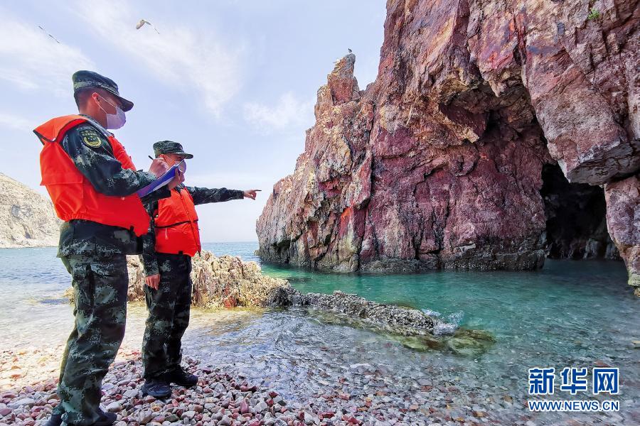 海警執(zhí)法員對轄區(qū)無居民海島進(jìn)行檢查(5月20日攝)。新華社發(fā)(包新宇 攝)