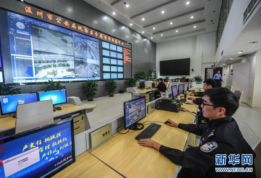 浙江省溫州市甌海區(qū)公安分局指揮中心內(nèi),警務(wù)人員在后臺實(shí)時(shí)監(jiān)控各類動態(tài)信息(2018年11月14日攝)。該局依托互聯(lián)網(wǎng)大數(shù)據(jù)等新手段,打造管理新模式,全面提升了警務(wù)效能。新華社記者 徐昱 攝