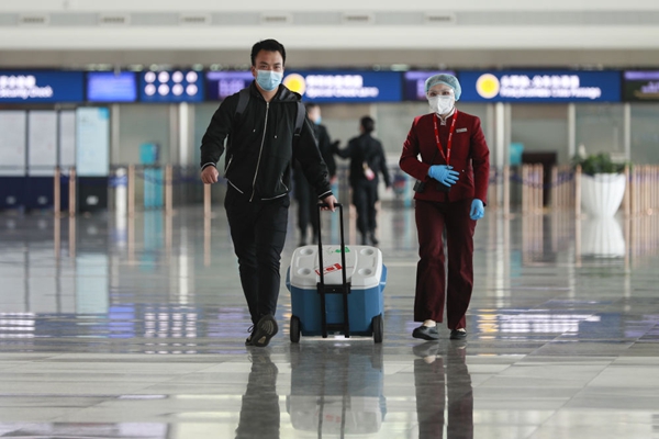 ▲ 2020年4月24日,武漢協(xié)和醫(yī)院心外科醫(yī)生盧雄豪(左)運(yùn)送來自山東的供肺抵達(dá)武漢天河機(jī)場。疫情期間原定航班取消,移植團(tuán)隊與中國國際航空公司聯(lián)系后,該公司緊急啟動綠色通道,重新開通此航班。新華社記者 沈伯韓攝