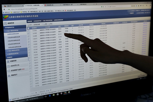 ▲ 在首都醫(yī)科大學(xué)附屬北京友誼醫(yī)院,一臺電腦顯示“中國人體器官分配與共享計算機(jī)系統(tǒng)”(COTRS)中的人體器官移植等待者預(yù)約名單。新華社記者 沈伯韓攝