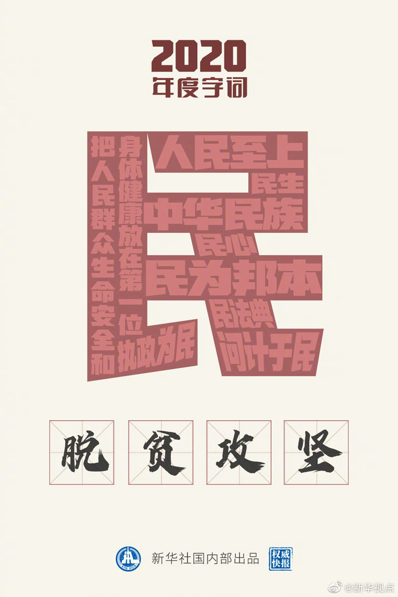 “民”當(dāng)選2020年度“國內(nèi)字”;“脫貧攻堅(jiān)”當(dāng)選2020年度“國內(nèi)詞”。國家語言資源監(jiān)測與研究中心、商務(wù)印書館等21日發(fā)布“漢語盤點(diǎn)2020”年度字詞,定格我國年度記憶。這一年,從抗疫抗洪到民法典誕生、謀劃開啟“十四五”新征程,處處閃耀“人民至上”理念;這一年,如期完成脫貧攻堅(jiān)目標(biāo)任務(wù),千年夙愿,今朝夢圓!?