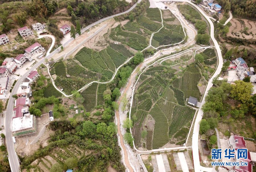這是2020年4月17日拍攝的金寨縣花石鄉(xiāng)大灣村的茶產(chǎn)業(yè)扶貧基地(無(wú)人機(jī)照片)。新華社記者劉軍喜攝