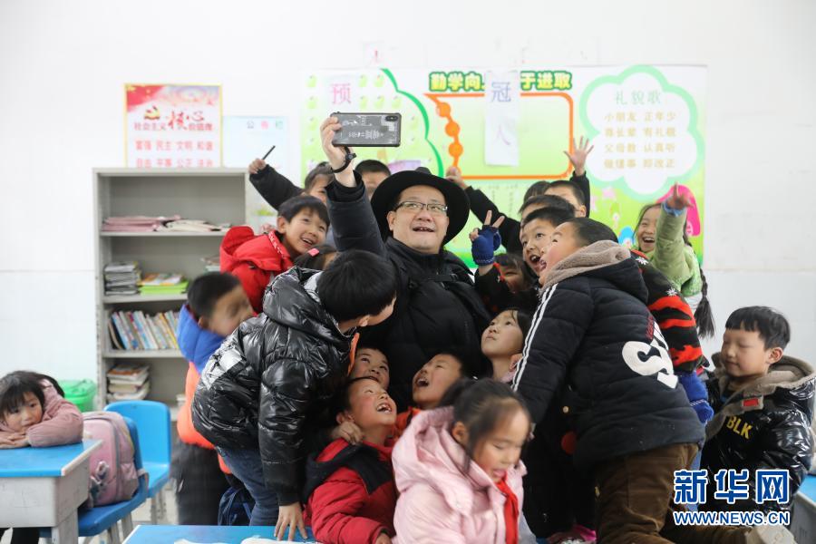 2020年12月17日,植國(guó)明在大灣小學(xué)和孩子們自拍。新華社記者 曹力攝