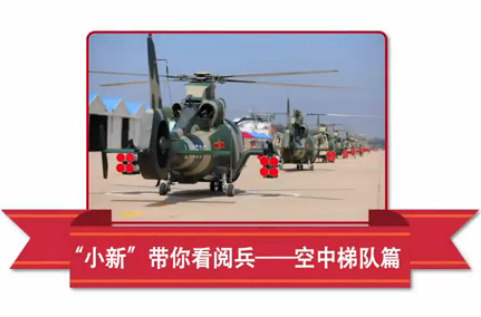 方隊由26架直升機和7架教練機組成。國旗和軍旗分別由1架直升機在正下方懸掛、由2架直升機護衛(wèi),組成兩組三機梯隊,呈品字形依次通過。緊隨其后的是由20架直升機組成“70”字樣,寓意中華民族以抗戰(zhàn)勝利為起點走向偉大復(fù)興的征程。這是我國在閱兵中首次采用紀(jì)念數(shù)字的編隊飛行。