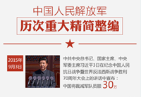 中共中央總書記、國家主席、中央軍委主席習(xí)近平3日在紀(jì)念中國人民抗日戰(zhàn)爭暨世界反法西斯戰(zhàn)爭勝利70周年大會上的講話中宣布:中國將裁減軍隊員額30萬。
