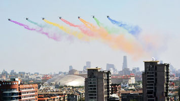 - 領(lǐng)隊機梯隊飛過天安門 8道彩煙絢麗奪目