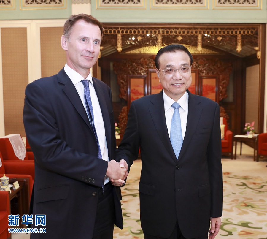 7月30日,國務院總理李克強在北京中南海紫光閣會見來華出席第九次中英戰(zhàn)略對話的英國外交大臣亨特。 新華社記者丁海濤攝