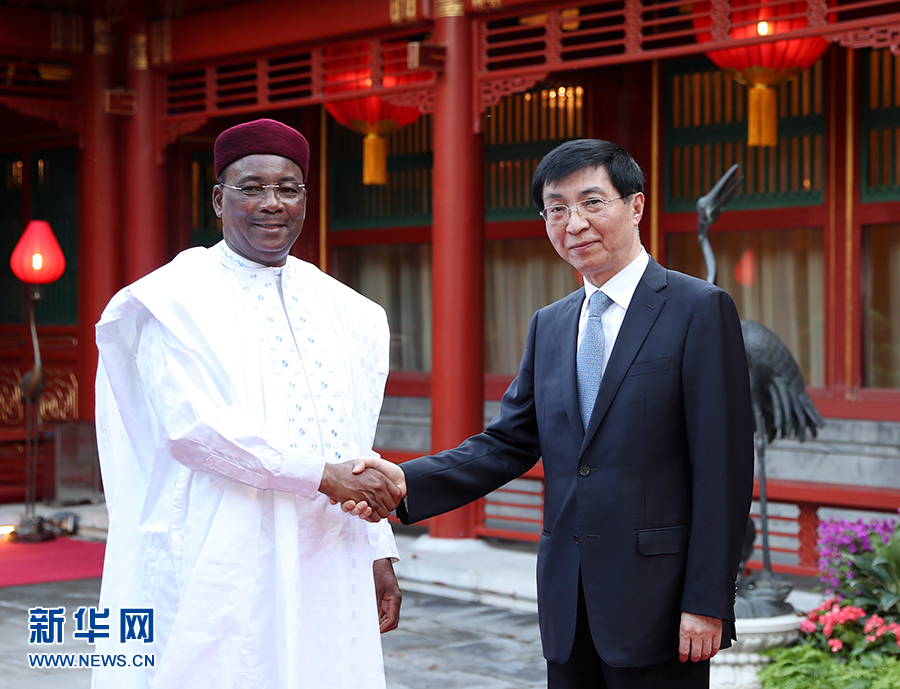 8月31日,中共中央政治局常委、中央書記處書記王滬寧在北京釣魚臺(tái)國(guó)賓館會(huì)見尼日爾總統(tǒng)伊素福。 新華社記者丁海濤攝