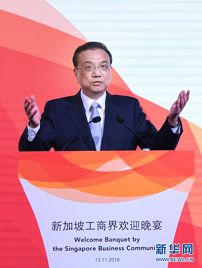當(dāng)?shù)貢r(shí)間11月13日晚,國務(wù)院總理李克強(qiáng)在新加坡出席新加坡工商聯(lián)合總會(huì)和中華總商會(huì)聯(lián)合舉辦的歡迎晚宴并致辭。 新華社記者 申宏 攝