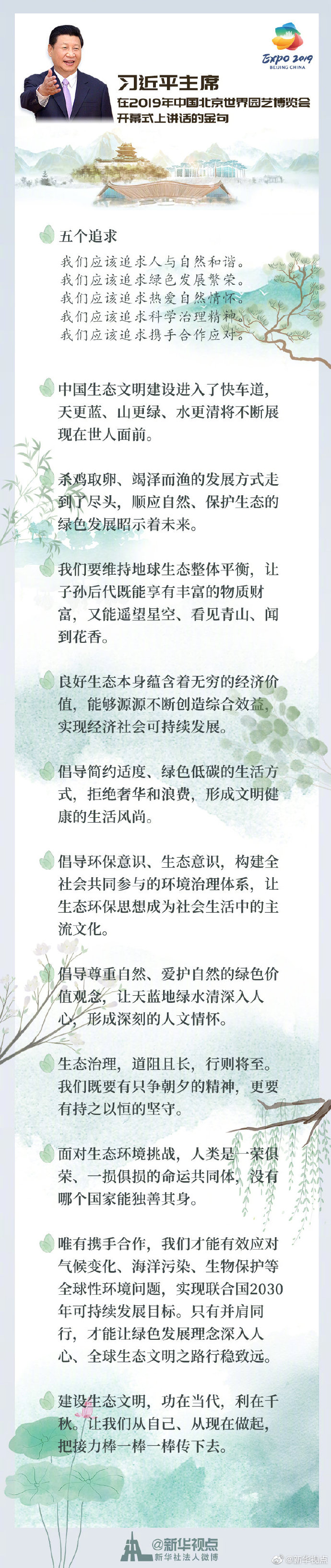 習(xí)近平在2019年中國北京世界園藝博覽會開幕式上講話的金句
