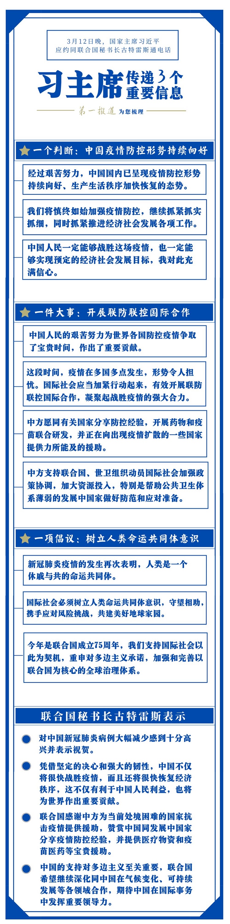 對(duì)疫情防控國(guó)際合作這件大事,習(xí)主席一直十分關(guān)心。此前,在內(nèi)外事活動(dòng)中,他曾多次提及。這一次同古特雷斯通電話,習(xí)主席有更明確闡述。