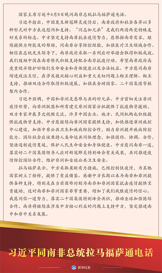 拉馬福薩表示,中方采取果斷有力措施,已經控制住疫情,為其他國家樹立了榜樣,提供了有益借鑒。感謝中方長期以來為南非和非洲提供各種支持,特別是在當前困難時刻為南非和非洲國家抗擊疫情提供寶貴援助,這對南非和非洲國家非常重要,增加了我們戰(zhàn)勝疫情的信心。我愿同你一道努力,落實二十國集團特別峰會共識,推動全球加強團結合作。南非將繼續(xù)在涉及中方核心利益的問題上支持中方,堅定推進南中和非中關系發(fā)展。