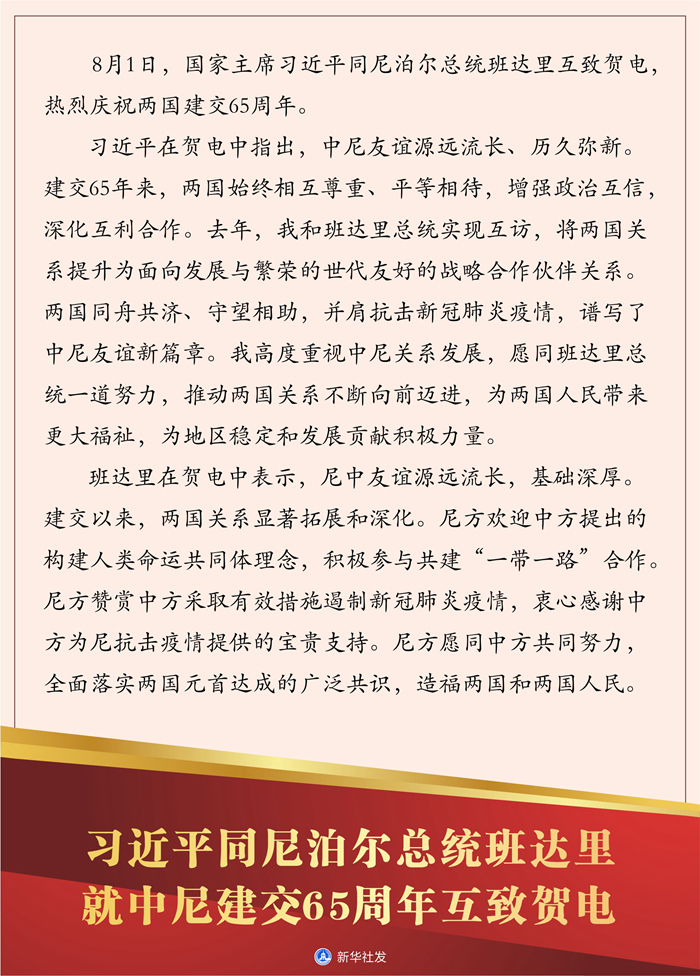 習(xí)近平在賀電中指出,中尼友誼源遠(yuǎn)流長(zhǎng)、歷久彌新。建交65年來(lái),兩國(guó)始終相互尊重、平等相待,增強(qiáng)政治互信,深化互利合作。去年,我和班達(dá)里總統(tǒng)實(shí)現(xiàn)互訪,將兩國(guó)關(guān)系提升為面向發(fā)展與繁榮的世代友好的戰(zhàn)略合作伙伴關(guān)系。兩國(guó)同舟共濟(jì)、守望相助,并肩抗擊新冠肺炎疫情,譜寫(xiě)了中尼友誼新篇章。我高度重視中尼關(guān)系發(fā)展,愿同班達(dá)里總統(tǒng)一道努力,推動(dòng)兩國(guó)關(guān)系不斷向前邁進(jìn),為兩國(guó)人民帶來(lái)更大福祉,為地區(qū)穩(wěn)定和發(fā)展貢獻(xiàn)積極力量。