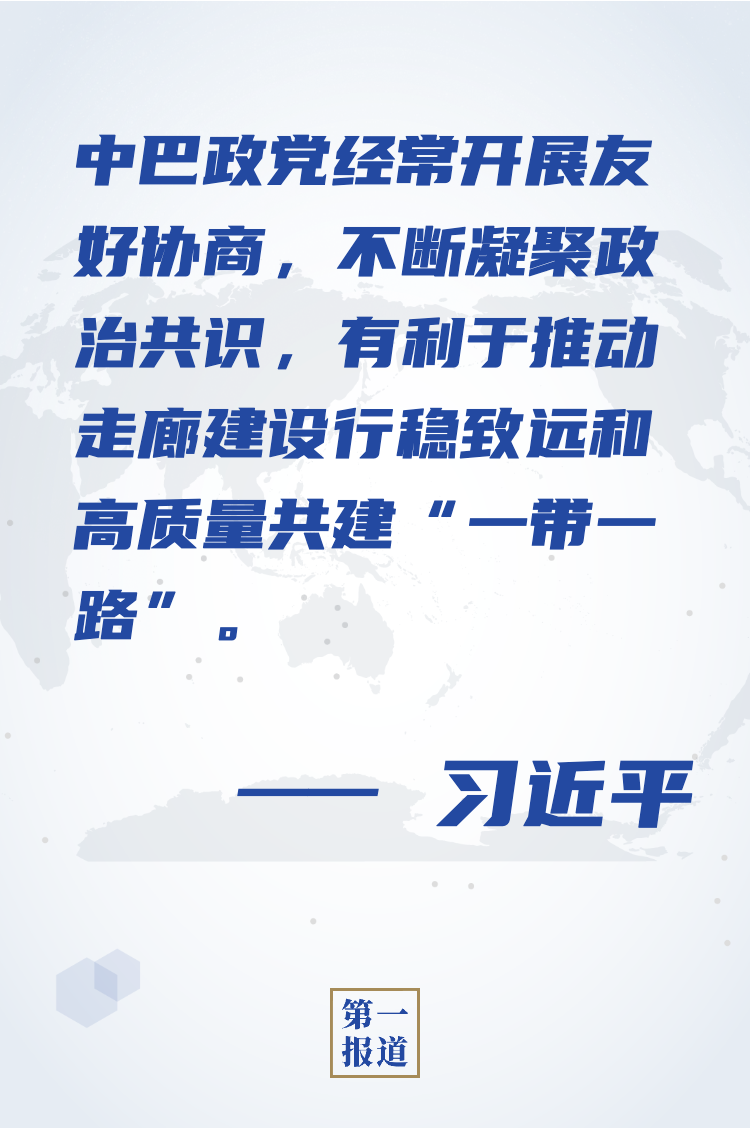 習(xí)近平指出,中巴是有著特殊友好情誼的好兄弟、好伙伴。中巴經(jīng)濟走廊是“一帶一路”建設(shè)的標志性項目,對推動中巴全天候戰(zhàn)略合作伙伴關(guān)系深入發(fā)展、打造更加緊密的中巴命運共同體具有重要意義。中巴政黨經(jīng)常開展友好協(xié)商,不斷凝聚政治共識,有利于推動走廊建設(shè)行穩(wěn)致遠和高質(zhì)量共建“一帶一路”。