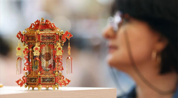 敦煌研究院文物数字化保护团队创意营销人员廖雪婷在整理文创产品(4月25日摄)。