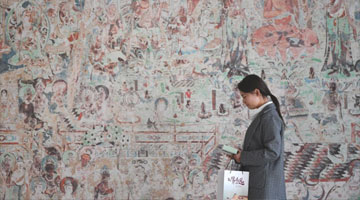 敦煌研究院文物数字化保护团队创意营销人员廖雪婷从一幅高保真复制壁画前走过(4月25日摄)。