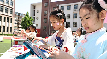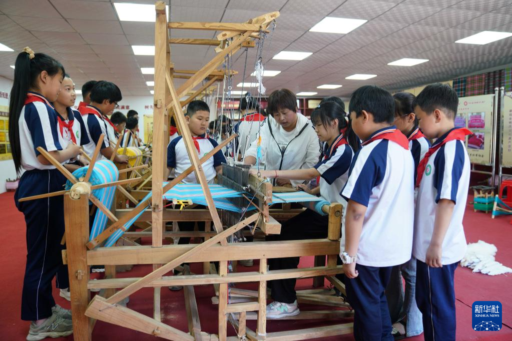 5月24日,小学生在河北省沙河市塔子峪村非遗传习所内体验四匹缯布制作技艺。