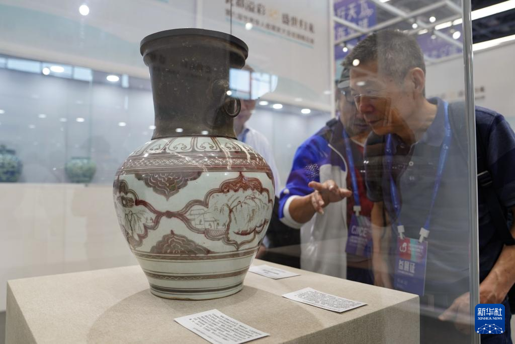 10月18日,参观者在瓷博会现场举办的第六届世界华人收藏家大会瓷器精品展上观赏展品。