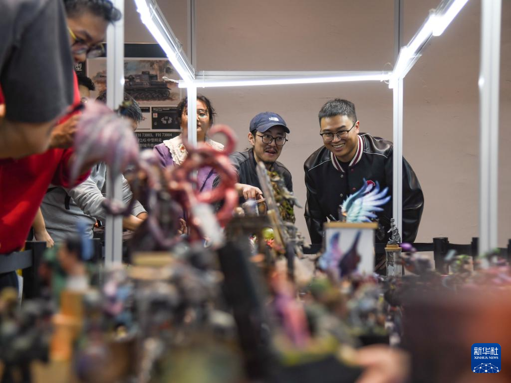在成都天府国际动漫城,曾舟(右一)和参加静态模型创意大赛的参赛选手交流(2024年10月26日摄)。