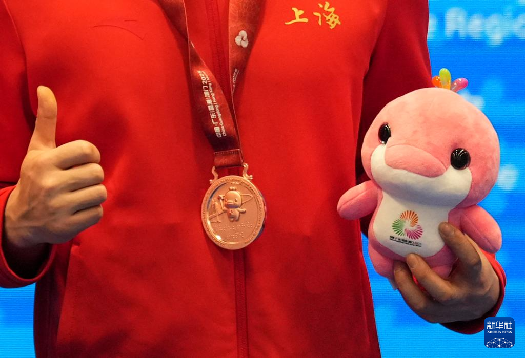 12月13日,获得铜牌的陈利强在男子个人重剑A级颁奖仪式上手持吉祥物“乐融融”。